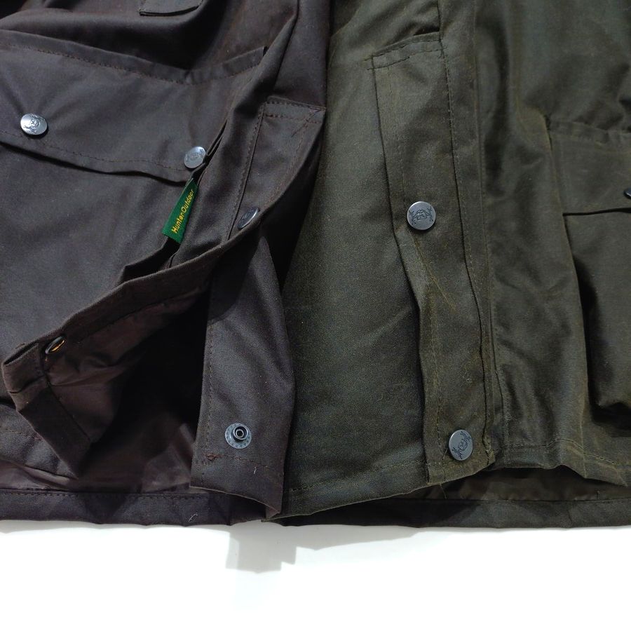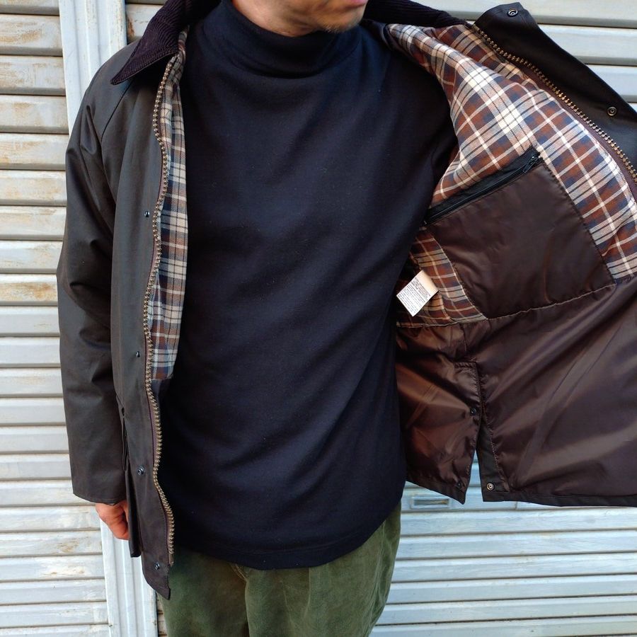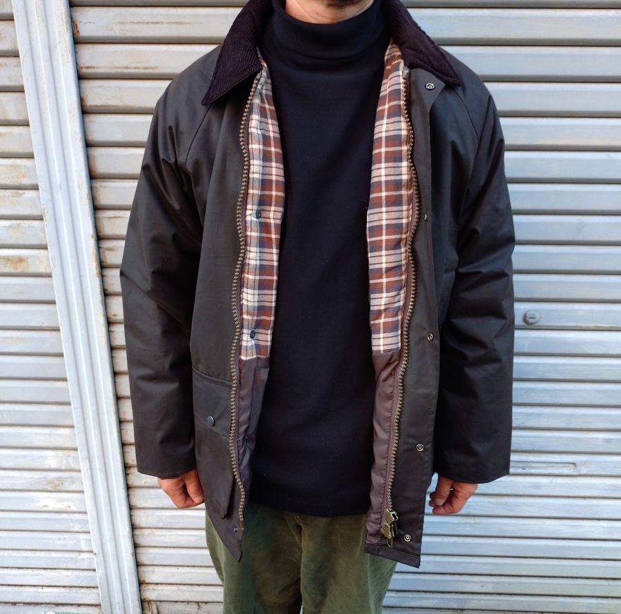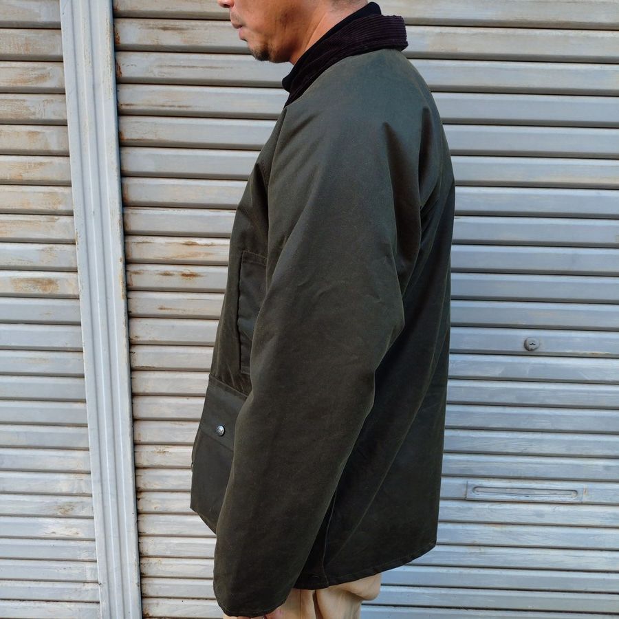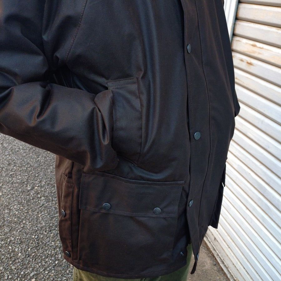 雨が多いイギリスのライフスタイルから生まれた、コットンベースの生地にワックス(オイル)を塗り防水性を高めた当時では画期的な素材となっており、現在も人気のある生地となっています。